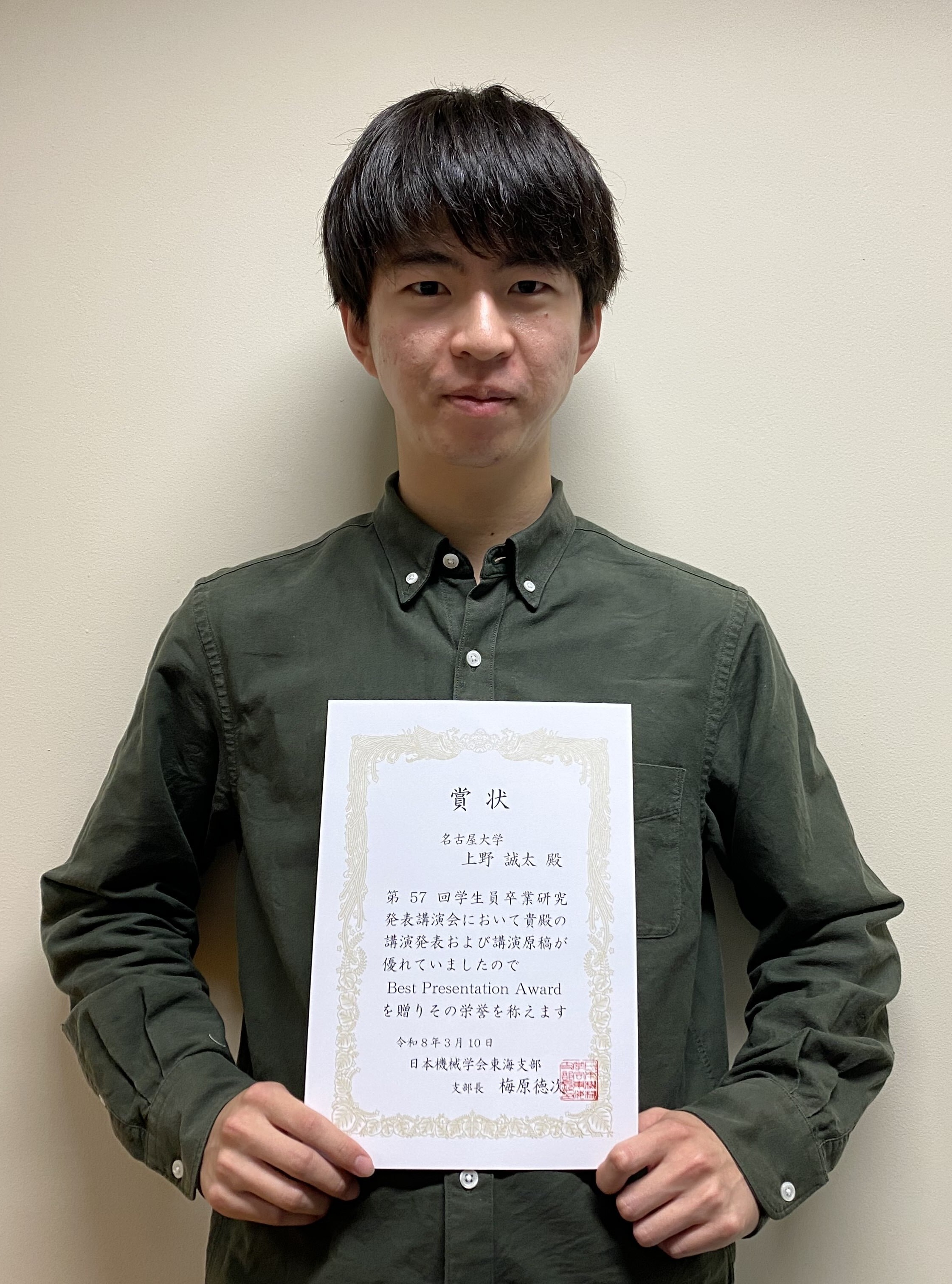 2025.03.25 野々垣翔真君が日本機械学会三浦賞を受賞しました